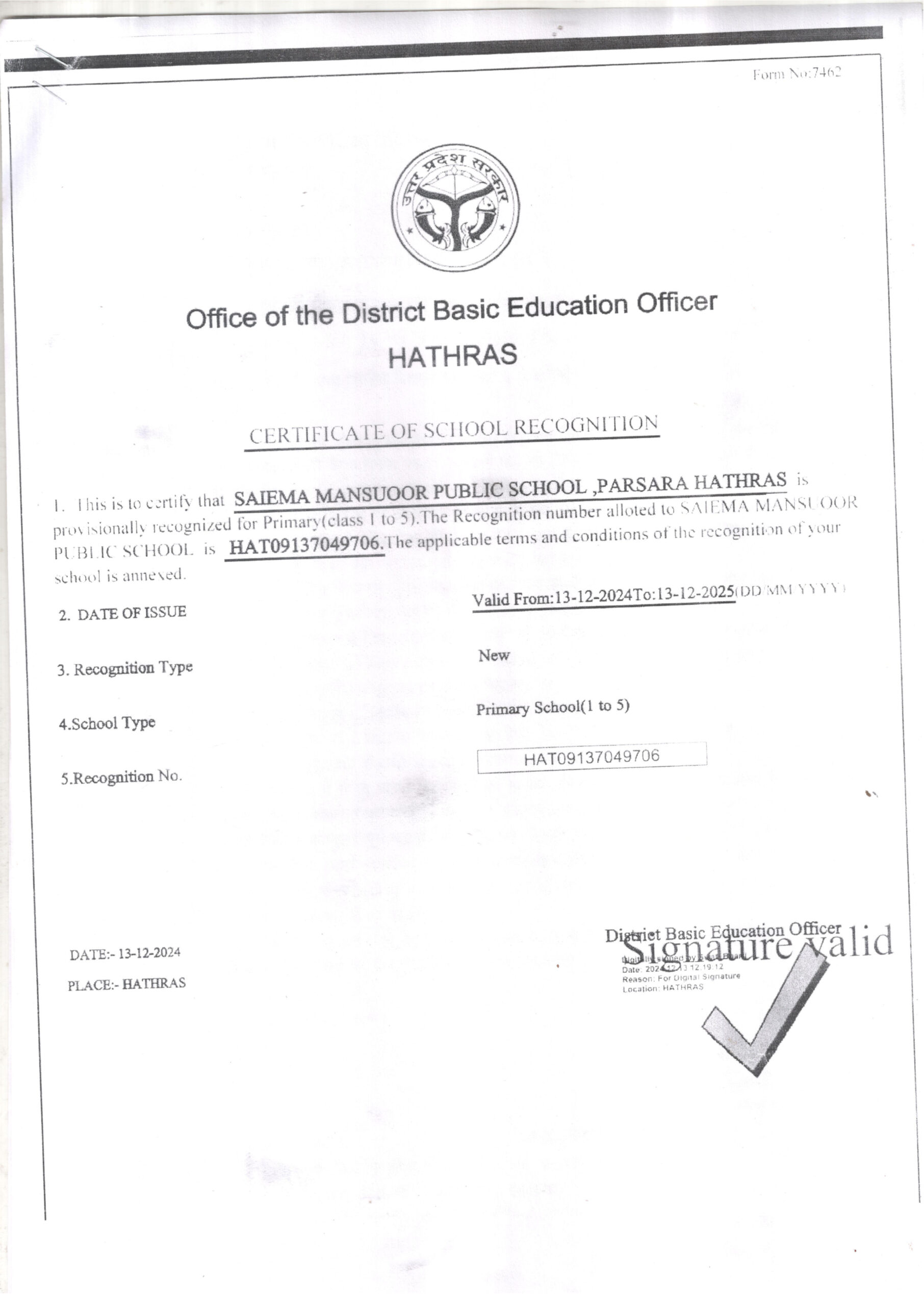 SELF CERTIFICATE SUBMITTED BY THE SCHOOL